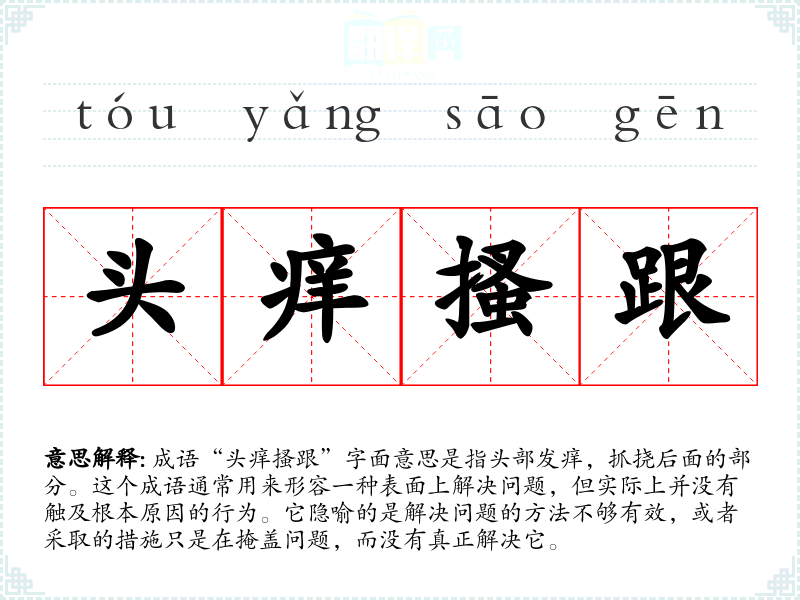 成语“头痒搔跟”字面意思是指头部发痒,抓挠后面的部分。这个成语通常用来形容一种表面上解决问题,但实际上并没有触及根本原因的行为。它隐喻的是解决问题的方法不够有效,或者采取的措施只是在掩盖问题,而没有真正解决它。