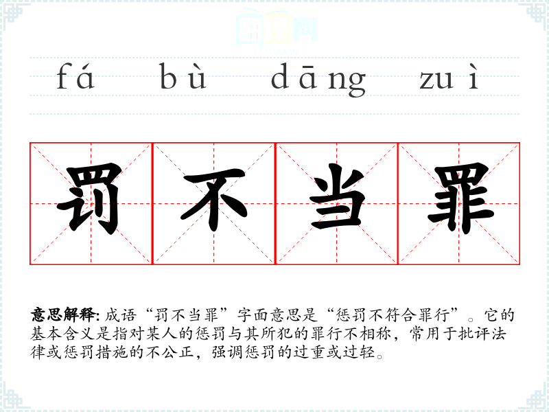 成语“罚不当罪”字面意思是“惩罚不符合罪行”。它的基本含义是指对某人的惩罚与其所犯的罪行不相称,常用于批评法律或惩罚措施的不公正,强调惩罚的过重或过轻。