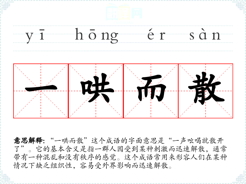 在英语中,可以用“scatter”或“disperse”来表达类似的含义,但这些词汇并不一定带有“一声吆喝”的指向性,而是更加强调行为的随机性和无序性。这显示了中文成语中对人群行为的细腻观察。