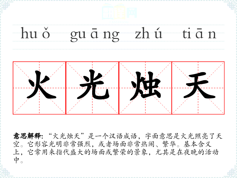 “火光烛天”是一个汉语成语,字面意思是火光照亮了天空。它形容光明非常强烈,或者场面非常热闹、繁华。基本含义上,它常用来指代盛大的场面或繁荣的景象,尤其是在夜晚的活动中。