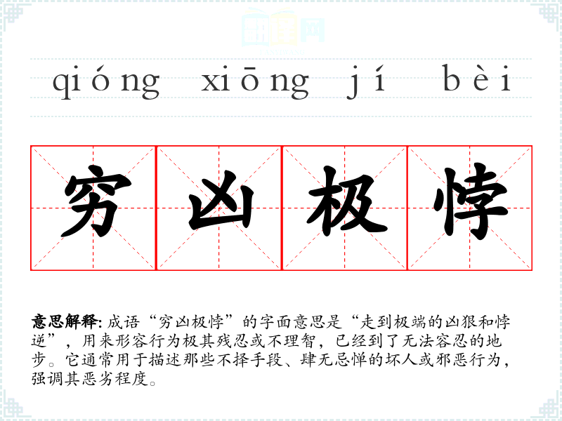 成语“穷凶极悖”的字面意思是“走到极端的凶狠和悖逆”,用来形容行为极其残忍或不理智,已经到了无法容忍的地步。它通常用于描述那些不择手段、肆无忌惮的坏人或邪恶行为,强调其恶劣程度。