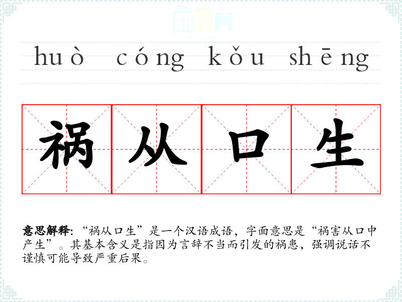 “祸从口生”是一个汉语成语,字面意思是“祸害从口中产生”。其基本含义是指因为言辞不当而引发的祸患,强调说话不谨慎可能导致严重后果。
