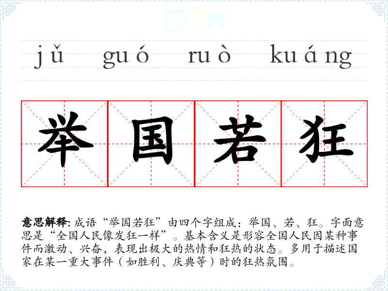 成语“举国若狂”由四个字组成:举国、若、狂。字面意思是“全国人民像发狂一样”。基本含义是形容全国人民因某种而激动、兴奋,表现出极大的热情和狂热的状态。多用于描述国家在某一重大(如胜利、庆典等)时的狂热氛围。