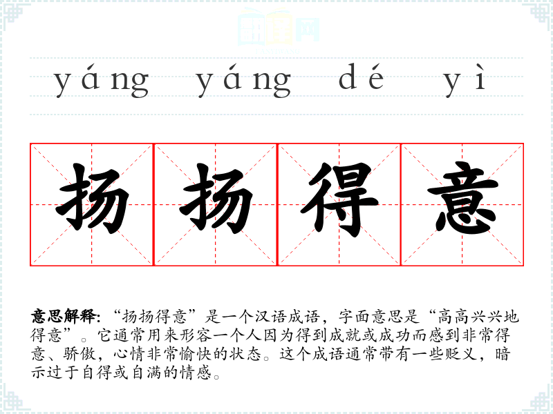 “扬扬得意”是一个汉语成语,字面意思是“高高兴兴地得意”。它通常用来形容一个人因为得到成就或成功而感到非常得意、骄傲,心情非常愉快的状态。这个成语通常带有一些贬义,暗示过于自得或自满的情感。