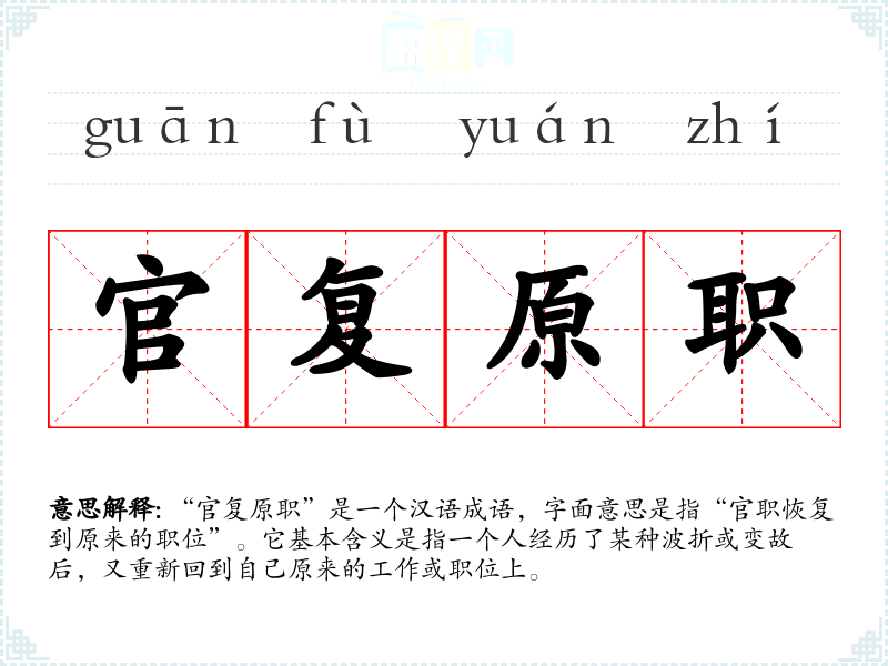 “官复原职”是一个汉语成语,字面意思是指“官职恢复到原来的职位”。它基本含义是指一个人经历了某种波折或变故后,又重新回到自己原来的工作或职位上。