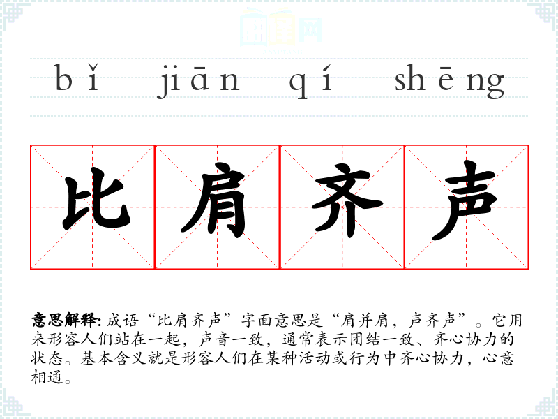 成语“比肩齐声”字面意思是“肩并肩,声齐声”。它用来形容人们站在一起,声音一致,通常表示团结一致、齐心协力的状态。基本含义就是形容人们在某种活动或行为中齐心协力,心意相通。