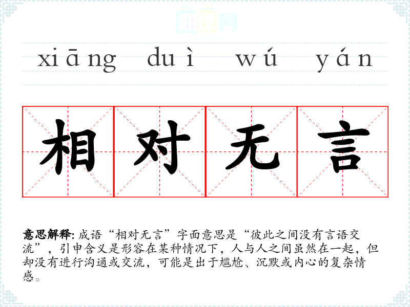 成语“相对无言”字面意思是“彼此之间没有言语交流”,引申含义是形容在某种情况下,人与人之间虽然在一起,但却没有进行沟通或交流,可能是出于尴尬、沉默或内心的复杂情感。