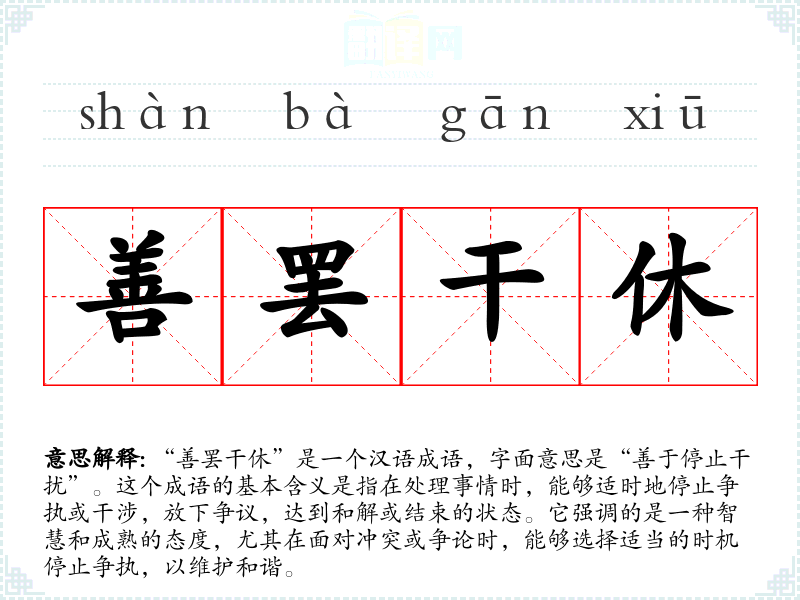 “善罢干休”是一个汉语成语,字面意思是“善于停止干扰”。这个成语的基本含义是指在处理事情时,能够适时地停止争执或干涉,放下争议,达到和解或结束的状态。它强调的是一种智慧和成熟的态度,尤其在面对冲突或争论时,能够选择适当的时机停止争执,以维护和谐。