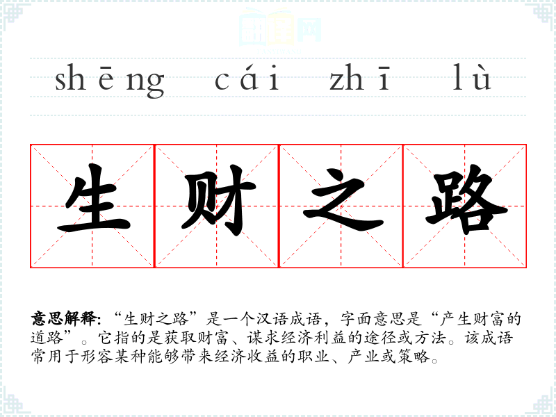 “生财之路”并没有明确的历史典故或文学出处,它的构成词汇相对简单,来源于日常生活中的财富追求。这个成语可以被视为对经济活动和商业运作的总结,反映了人们在经济生活中对财富的渴望和追求。