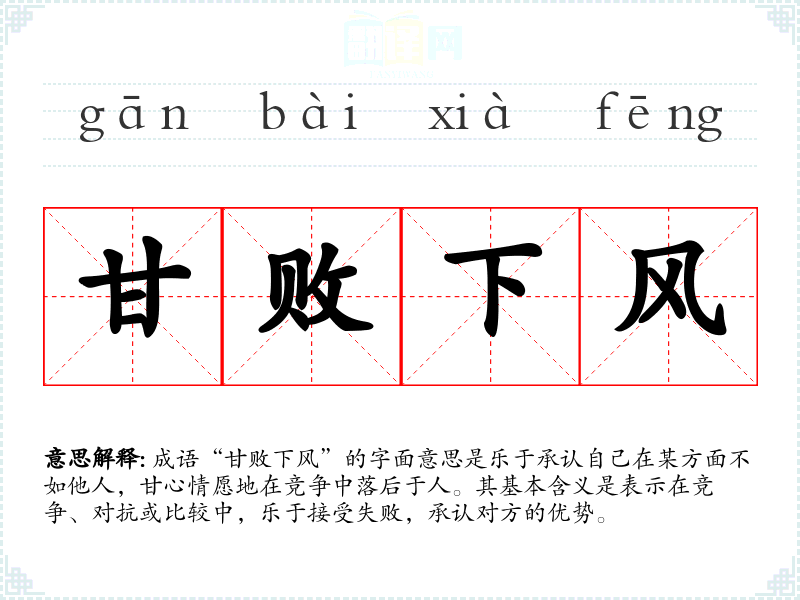 在*文化中,谦逊被视为一种美德。成语“甘败下风”反映了这种文化背景,强调在竞争中能够承认他人优点的重要性。在现代社会,尤其是在职场竞争日益激烈的环境中,能够甘心接受失败并从中学,是一种非常值得赞赏的品质。