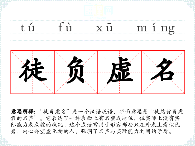 “徒负虚名”是一个汉语成语,字面意思是“徒然背负虚假的名声”。它表达了一种表面上有名望或地位,但实际上没有实际能力或成就的状况。这个成语常用于形容那些只在外表上看似优秀,内心却空虚无物的人,强调了名声与实际能力之间的矛盾。