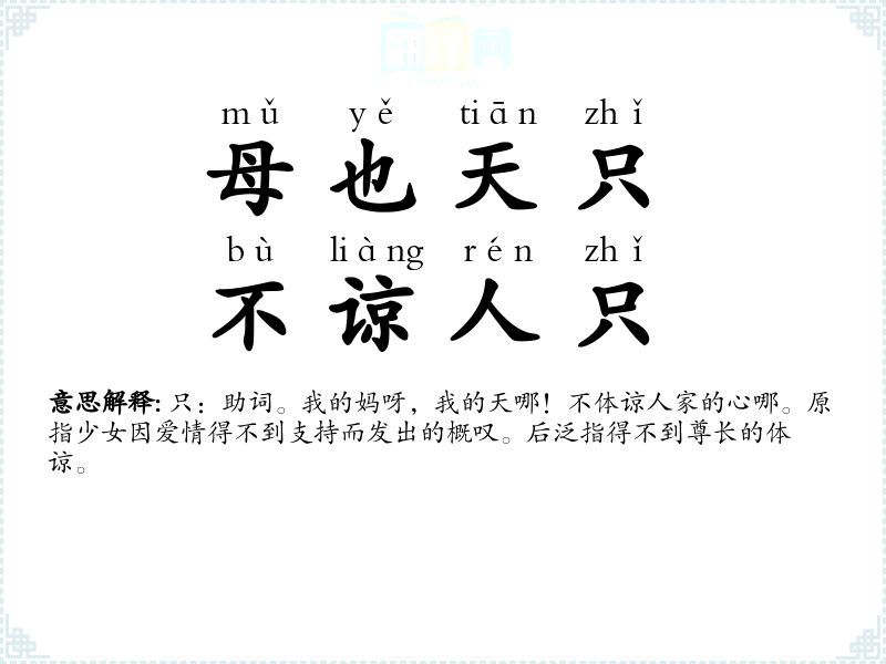 只:助词。我的妈呀,我的天哪!不体谅人家的心哪。原指少女因爱情得不到支持而发出的概叹。后泛指得不到尊长的体谅。 |