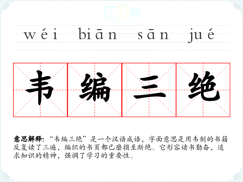 “韦编三绝”是一个汉语成语,字面意思是用韦制的书籍反复读了三遍,编织的书页都已磨损至断绝。它形容读书勤奋,追求知识的精神,强调了学*的重要性。
