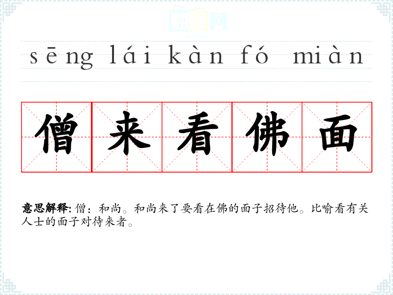 | 僧来看佛面 | 僧:和尚。和尚来了要看在佛的面子招待他。比喻看有关人士的面子对待来者。 |