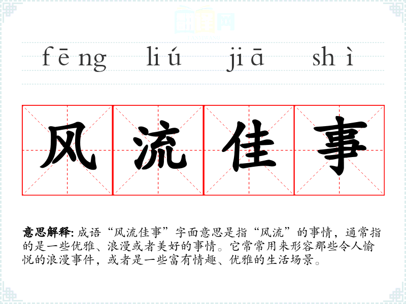 “风流佳事”并非出自某一特定的文学作品或历史典故,而是一个由“风流”和“佳事”两个词组合而成的成语。在古代文学中,“风流”常常与才华、风采、魅力相关联,而“佳事”则指的是美好的事情。因此,整体上它表达人们对美好生活和浪漫经历的向往。