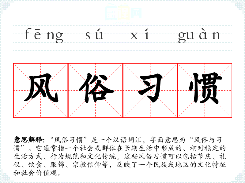 | 风俗习惯 | 个人或集体的传统风尚、礼节、习性。 |