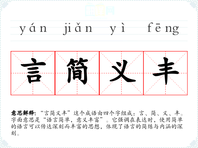 “言简义丰”这个成语由四个字组成:言、简、义、丰。字面意思是“语言简单,意义丰富”。它强调在表达时,使用简单的语言可以传达深刻而丰富的思想,体现了语言的简练与内涵的深刻。