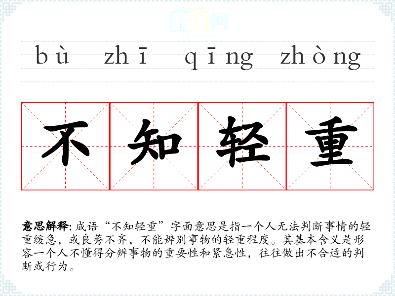 成语“不知轻重”字面意思是指一个人无法判断事情的轻重缓急,或良莠不齐,不能辨别事物的轻重程度。其基本含义是形容一个人不懂得分辨事物的重要性和紧急性,往往做出不合适的判断或行为。