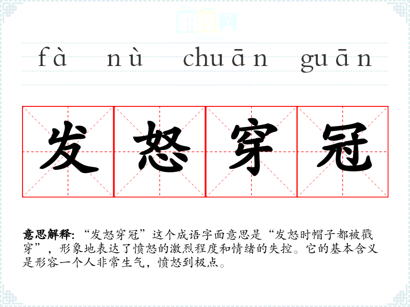 “发怒穿冠”这个成语字面意思是“发怒时帽子都被戳穿”,形象地表达了愤怒的激烈程度和情绪的失控。它的基本含义是形容一个人非常生气,愤怒到极点。