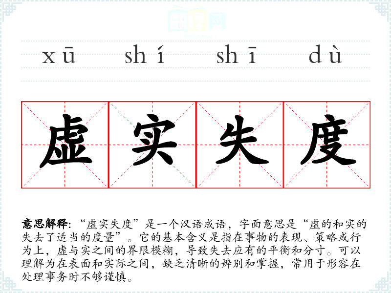 “虚实失度”是一个汉语成语,字面意思是“虚的和实的失去了适当的度量”。它的基本含义是指在事物的表现、策略或行为上,虚与实之间的界限模糊,导致失去应有的平衡和分寸。可以理解为在表面和实际之间,缺乏清晰的辨别和掌握,常用于形容在处理事务时不够谨慎。