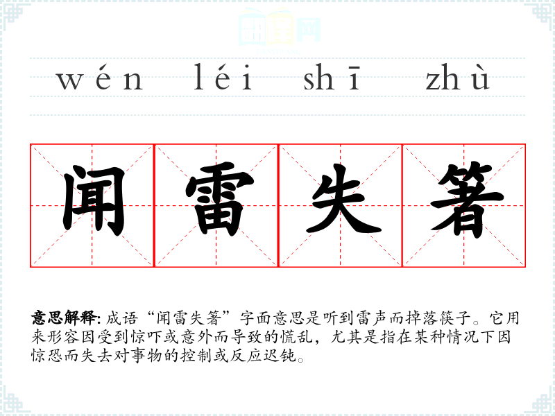 成语“闻雷失箸”字面意思是听到雷声而掉落筷子。它用来形容因受到惊吓或意外而导致的慌乱,尤其是指在某种情况下因惊恐而失去对事物的控制或反应迟钝。