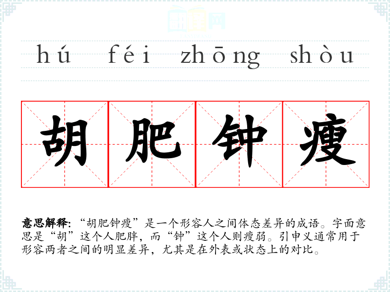 “胡肥钟瘦”是一个形容人之间体态差异的成语。字面意思是“胡”这个人肥胖,而“钟”这个人则瘦弱。引申义通常用于形容两者之间的明显差异,尤其是在外表或状态上的对比。
