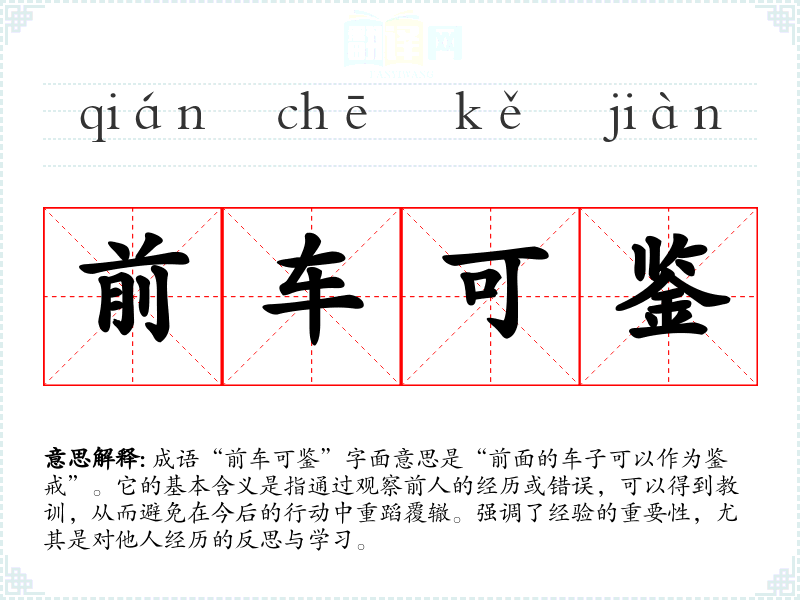 成语“前车可鉴”字面意思是“前面的车子可以作为鉴戒”。它的基本含义是指通过观察前人的经历或错误,可以得到教训,从而避免在今后的行动中重蹈覆辙。强调了经验的重要性,尤其是对他人经历的反思与学*。