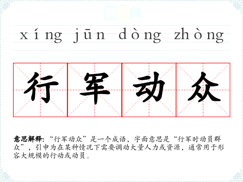 “行军动众”是一个成语,字面意思是“行军时动员群众”,引申为在某种情况下需要调动大量人力或资源,通常用于形容***的行动或动员。