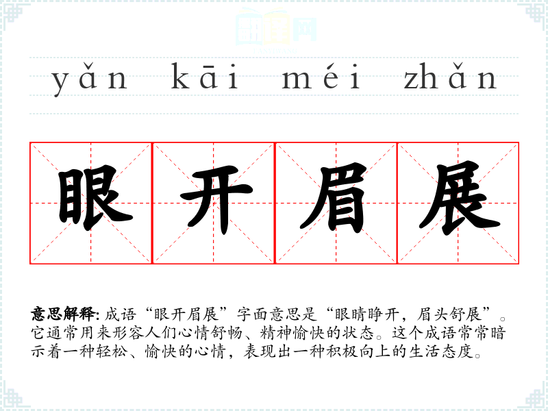 成语“眼开眉展”字面意思是“眼睛睁开,眉头舒展”。它通常用来形容人们心情舒畅、精神愉快的状态。这个成语常常暗示着一种轻松、愉快的心情,表现出一种积极向上的生活态度。