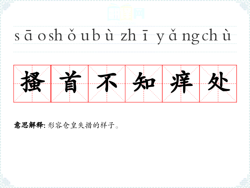 | 搔首不知痒处 | 形容仓皇失措的样子。 |