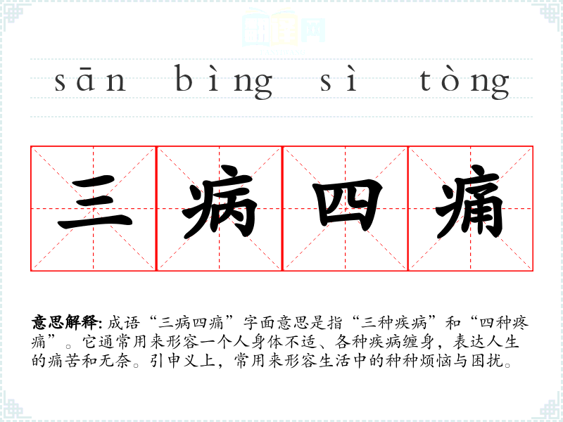 成语“三病四痛”字面意思是指“三种疾病”和“四种疼痛”。它通常用来形容一个人身体不适、各种疾病缠身,表达人生的痛苦和无奈。引申义上,常用来形容生活中的种种烦恼与困扰。