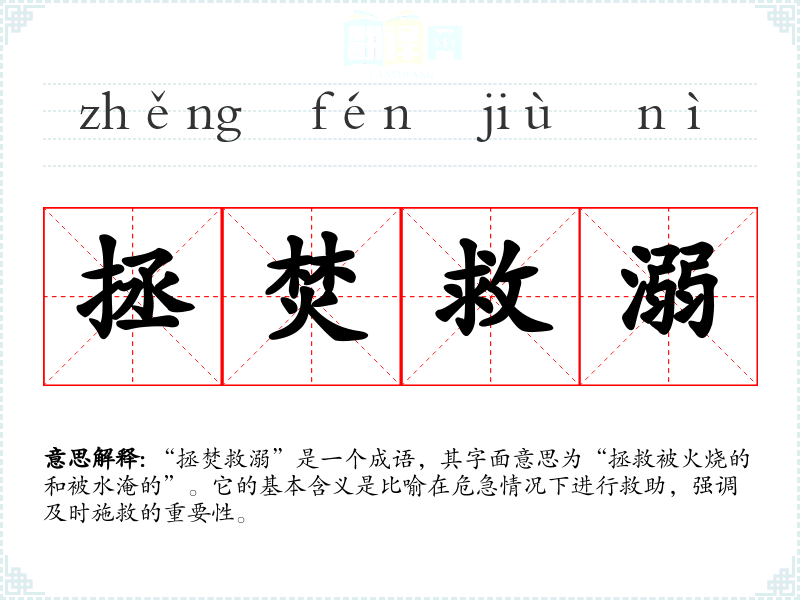 “拯焚救溺”是一个成语,其字面意思为“拯救被火烧的和被水淹的”。它的基本含义是比喻在危急情况下进行救助,强调及时施救的重要性。