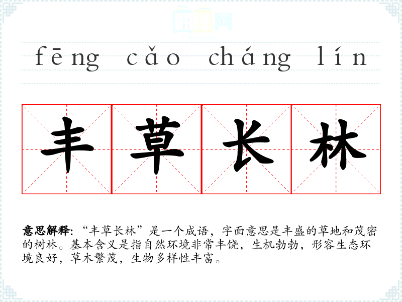 “丰草长林”是一个成语,字面意思是丰盛的草地和茂密的树林。基本含义是指自然环境非常丰饶,生机勃勃,形容生态环境良好,草木繁茂,生物多样性丰富。