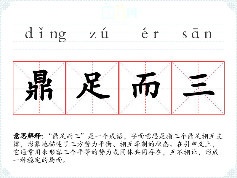 - 三足鼎立:与“鼎足而三”同义,强调三方平衡的状态。