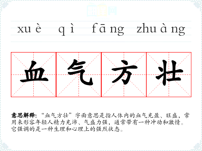 “血气方壮”字面意思是指人体内的血气充盈、旺盛,常用来形容年轻人精力充沛、气盛力强,通常带有一种冲动和激情。它强调的是一种生理和心理上的强烈状态。