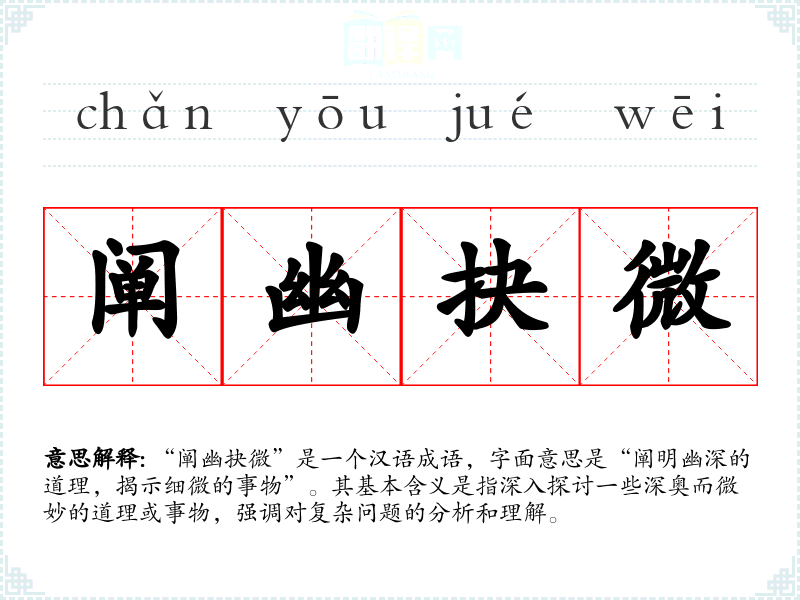 “阐幽抉微”是一个汉语成语,字面意思是“阐明幽深的道理,揭示细微的事物”。其基本含义是指深入探讨一些深奥而微妙的道理或事物,强调对复杂问题的分析和理解。