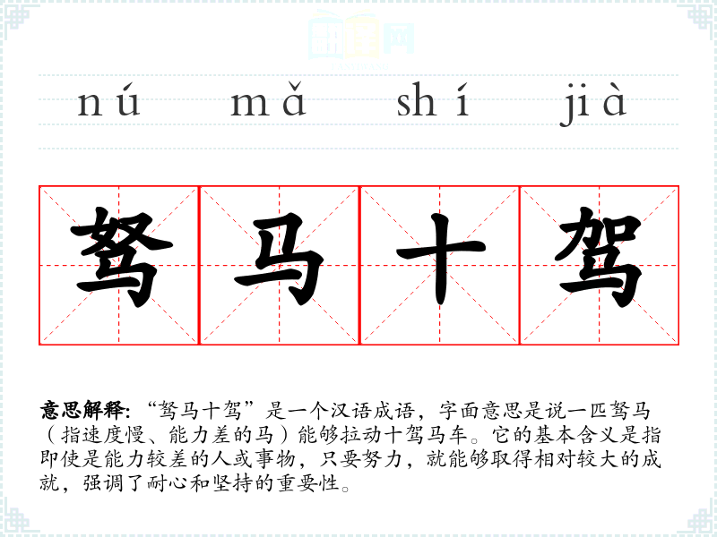 “驽马十驾”是一个汉语成语,字面意思是说一匹驽马(指速度慢、能力差的马)能够拉动十驾马车。它的基本含义是指即使是能力较差的人或事物,只要努力,就能够取得相对较大的成就,强调了耐心和坚持的重要性。