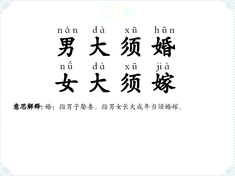 犹女大当嫁。指女子成年后须及时出嫁。 |