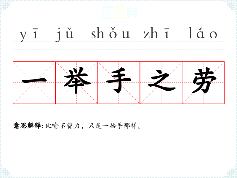 | 举手之劳 | 一举手那样的辛劳。形容轻而易举,毫不费力。 |