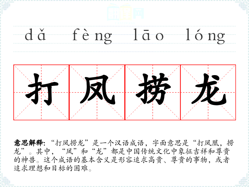在**文化中,凤和龙代表着理想、尊贵和吉祥。因此,“打凤捞龙”不仅是一种追求美好事物的象征,也反映了社会对成功和地位的渴望。在现代社会,这个成语依然适用,尤其是在职场竞争和个人奋斗的背景下。