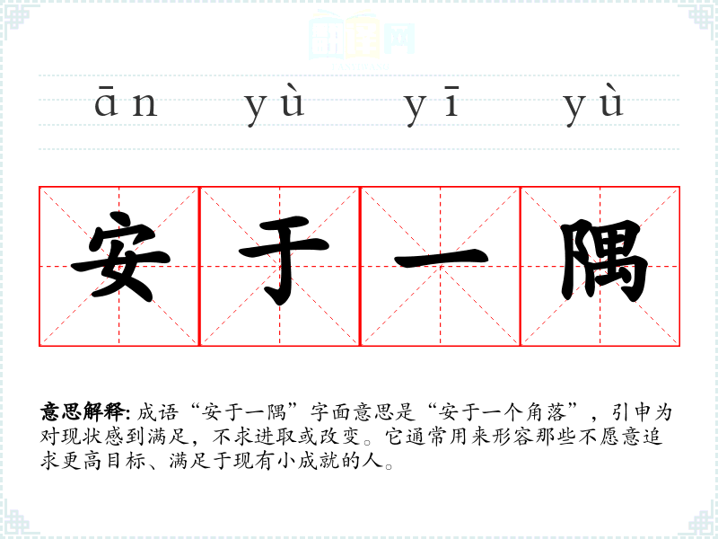 成语“安于一隅”字面意思是“安于一个角落”,引申为对现状感到满足,不求进取或改变。它通常用来形容那些不愿意追求更高目标、满足于现有小成就的人。