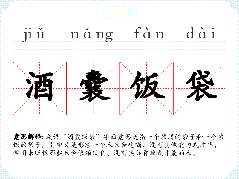 成语“酒囊饭袋”字面意思是指一个装酒的袋子和一个装饭的袋子。引申义是形容一个人只会吃喝,没有其他能力或才华,常用来贬低那些只会依赖饮食、没有实际贡献或才能的人。