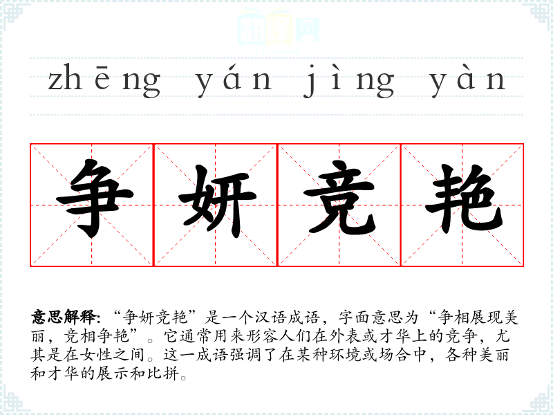 “争妍竞艳”是一个汉语成语,字面意思为“争相展现美丽,竞相争艳”。它通常用来形容人们在外表或才华上的竞争,尤其是在女性之间。这一成语强调了在某种环境或场合中,各种美丽和才华的展示和比拼。
