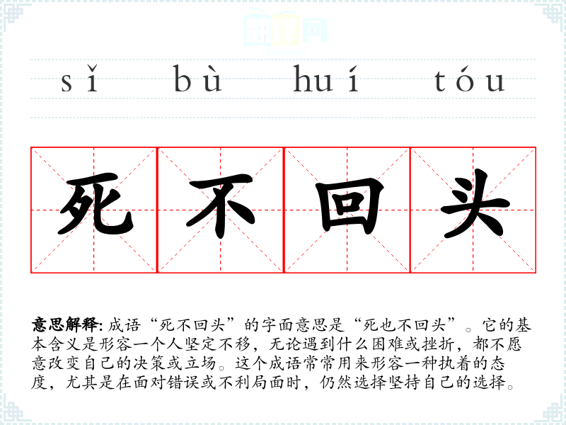 成语“死不回头”的字面意思是“死也不回头”。它的基本含义是形容一个人坚定不移,无论遇到什么困难或挫折,都不愿意改变自己的决策或立场。这个成语常常用来形容一种执着的态度,尤其是在面对错误或不利局面时,仍然选择坚持自己的选择。