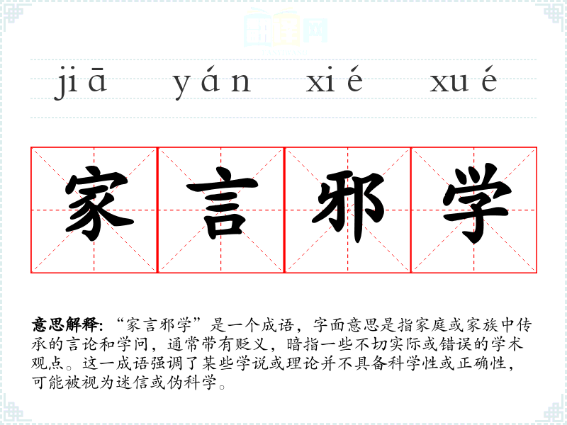 “家言邪学”是一个成语,字面意思是指家庭或家族中传承的言论和学问,通常带有贬义,暗指一些不切实际或错误的学术观点。这一成语强调了某些学说或理论并不具备科学性或正确性,可能被视为迷信或伪科学。