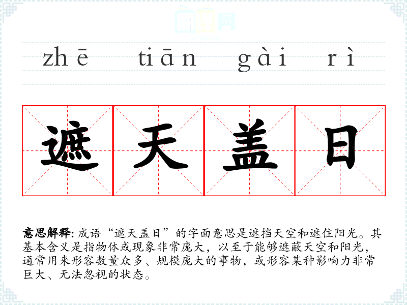 成语“遮天盖日”的字面意思是遮挡天空和遮住阳光。其基本含义是指物体或现象非常庞大,以至于能够遮蔽天空和阳光,通常用来形容数量众多、规模庞大的事物,或形容某种影响力非常巨大、无法忽视的状态。