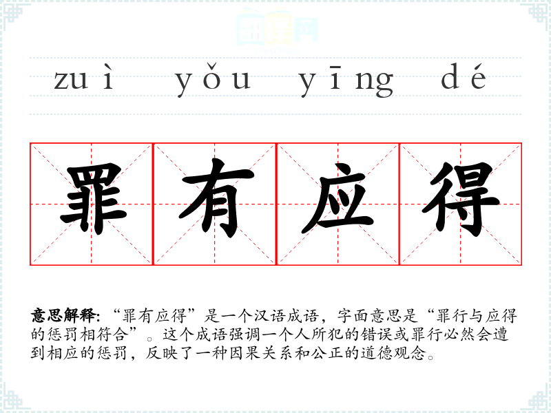 “罪有应得”是一个汉语成语,字面意思是“罪行与应得的惩罚相符合”。这个成语强调一个人所犯的错误或罪行必然会遭到相应的惩罚,反映了一种因果关系和公正的道德观念。