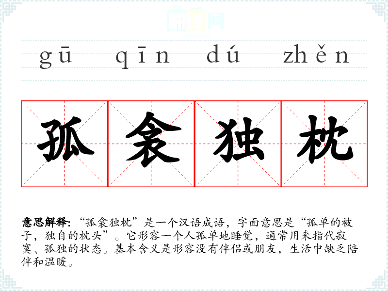 “孤衾独枕”是一个汉语成语,字面意思是“孤单的被子,独自的枕头”。它形容一个人孤单地睡觉,通常用来指代寂寞、孤独的状态。基本含义是形容没有伴侣或朋友,生活中缺乏陪伴和温暖。