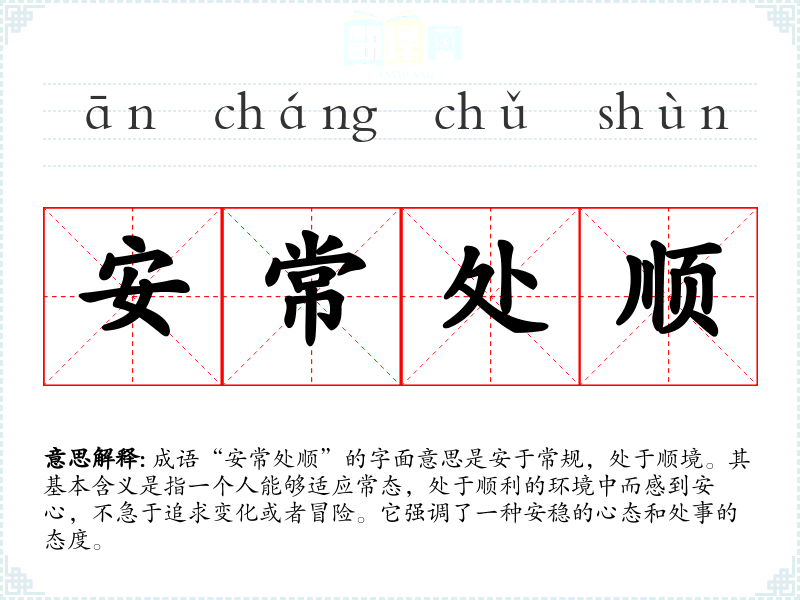 成语“安常处顺”的字面意思是安于常规,处于顺境。其基本含义是指一个人能够适应常态,处于顺利的环境中而感到安心,不急于追求变化或者冒险。它强调了一种安稳的心态和处事的态度。