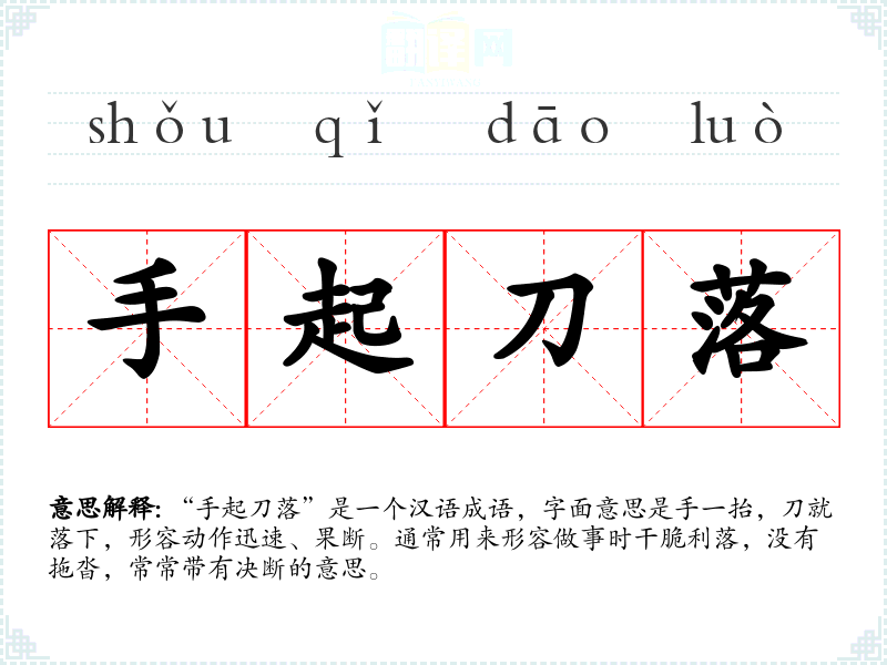 “手起刀落”是一个汉语成语,字面意思是手一抬,刀就落下,形容动作迅速、果断。通常用来形容做事时干脆利落,没有拖沓,常常带有决断的意思。